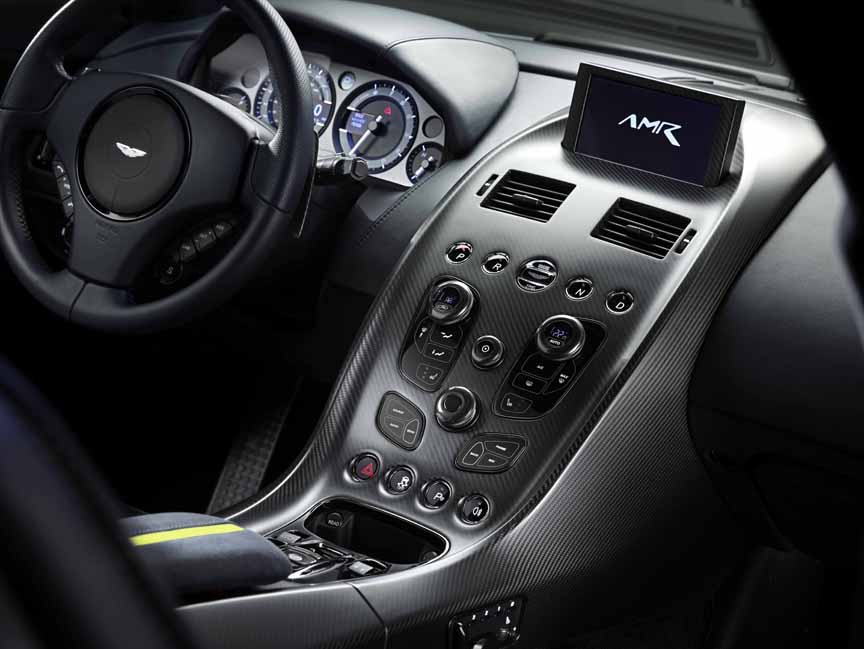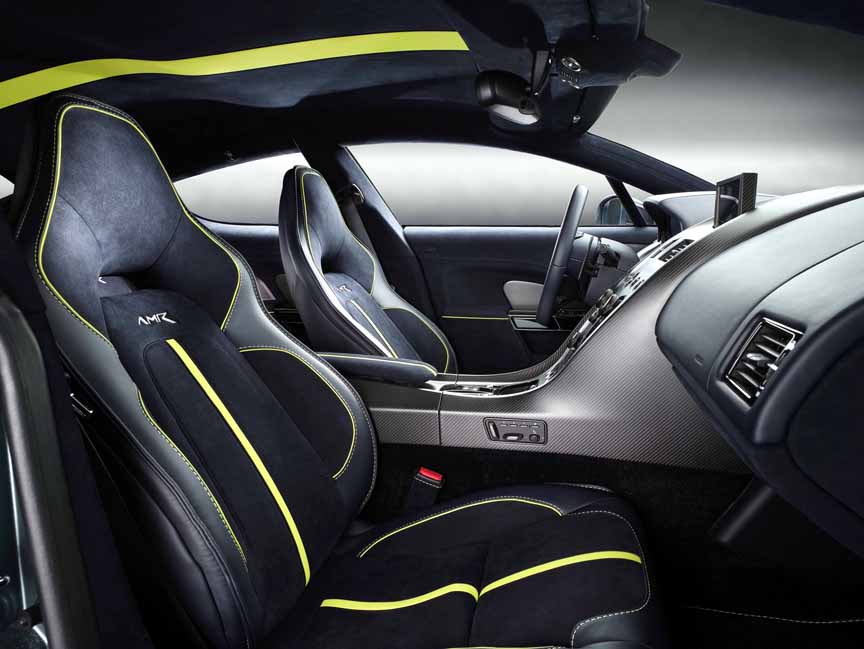The Rapide AMR’s aerodynamics have been tuned to reduce lift while retaining a neutral balance and the extra aerodynamic bodywork such as the splitter, sills, rear diffuser and boot lid lip spoiler are all carbon fiber. The new bonnet with large ventilation inserts is also made from carbon fiber to minimize weight.