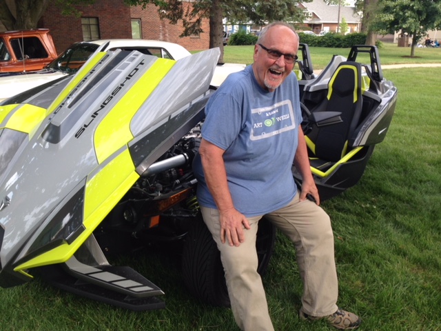 I left for home from the cruise-in not long before dusk. My rural route had me sharing the road with only the occasional farm tractor or pickup. With the sun at my back, the soft, early-evening light enriched the colors of our surroundings – the dark-green shoulder-high corn, lush young soybeans, faded barns, bio-diverse wetlands, woodlots and a few small herds of cattle. Distinctive odors come from each and wafted intensely into my consciousness. The Slingshot is one of the best ways I’ve found to soak up all that back-road ambiance.
