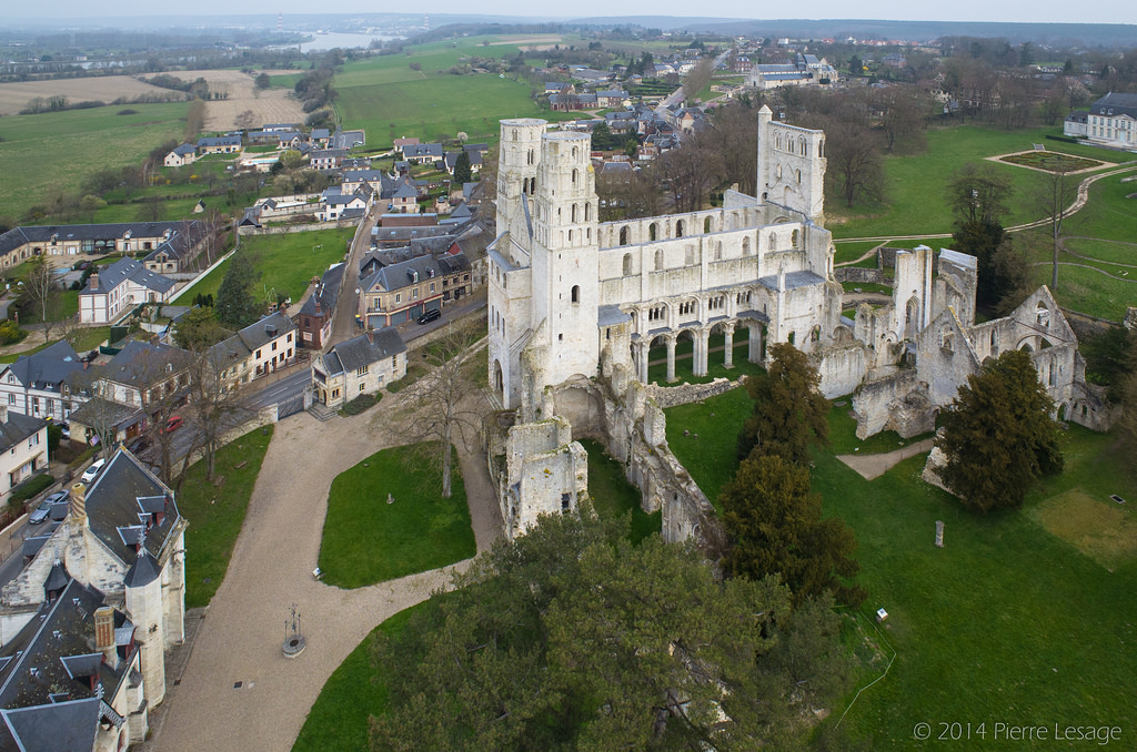 Our first three-star "Worth a Journey" sight is the Abbey of Jumieges, an enormous, roofless ruin on the Seine, parts of which date back to the 10th century. It's a ruin because no country has a monopoly on barbarians: by 1802, the few remaining monks of Jumieges had dispersed, their furniture had been auctioned off, and the once-splendid monastery was sold to a building-materials contractor who blew much of it up for its limestone blocks. Black pigeons wheel and bank through its once-vaulted chambers and galleries, squawking and arguing like old ladies, and the dazzling September sky makes a roof more vivid than the architects of Jumieges ever imagined.