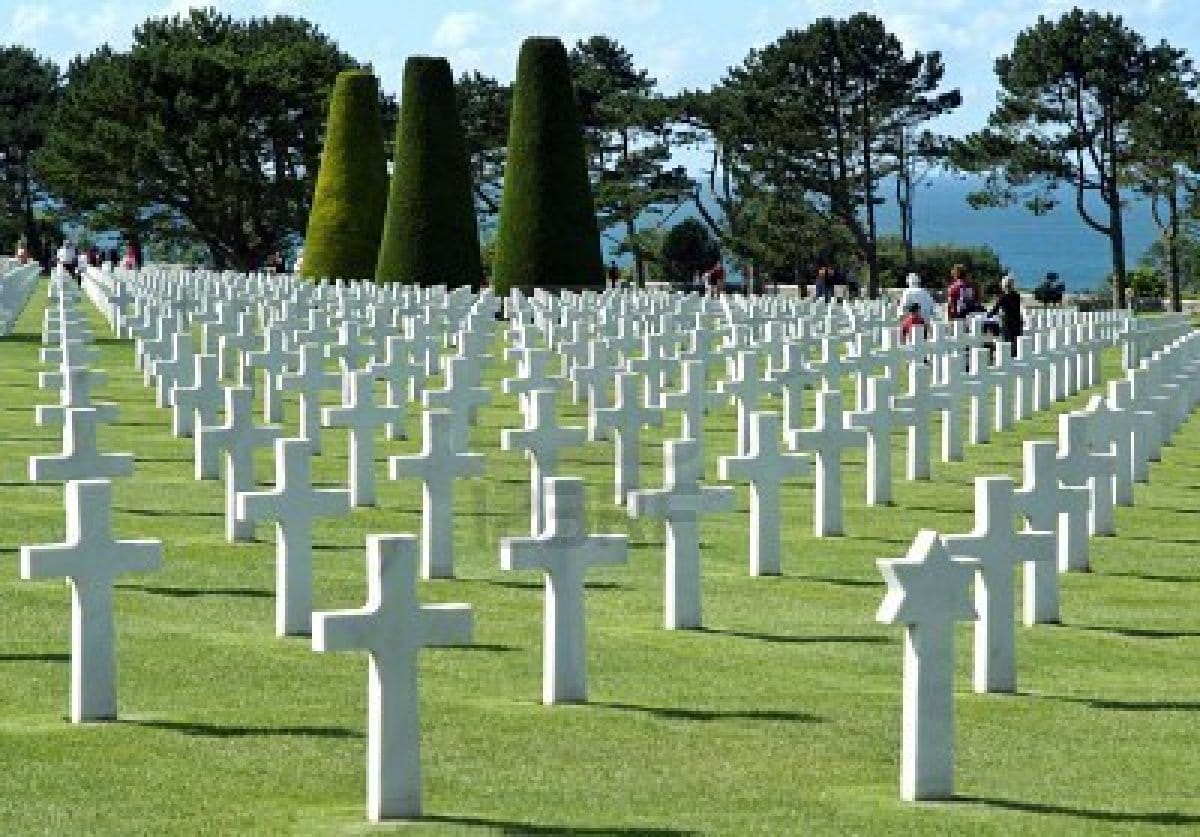 Everywhere in Normandy there are museums, monuments and memorials of the Invasion--gate-guardian Sherman tanks, rusted gun emplacements, endless displays filled with stiff waxwork figures of Yanks and Tommies in ill-fitting uniforms, dioramas and sand-table modelings of thrusting legions, and of course the cemeteries.