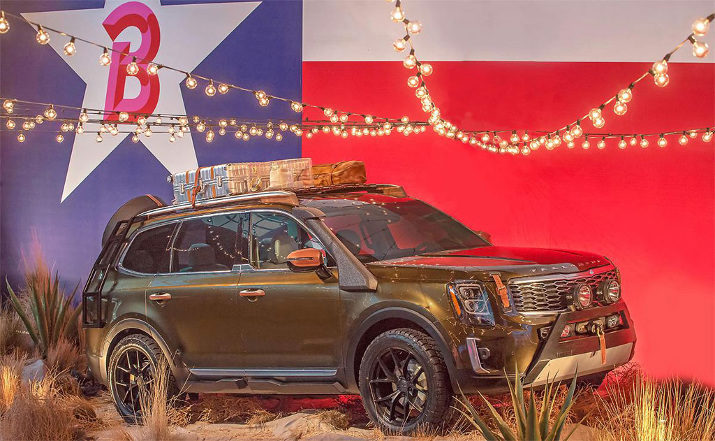 The Telluride’s green color reflects that of the concept car, that bowed in Detroit in 2016. Maxwell applied natural wood interior trim and saddle-inspired double-stitched leather on the dash, door panels and grab handles. Similar leather details cover the outside rearview mirrors and door handles, while the hood is secured by leather belt straps. Custom front and rear bumpers, skid plates and sidestep sills provide a Texan touch, together with a hidden winch and a snorkel for crossing deep rivers. The black alloy wheels have 265/50R-20 off-road tires, the spare tire has been custom mounted to the rear hatch, which opens to a metal- and leather-trimmed cargo area.