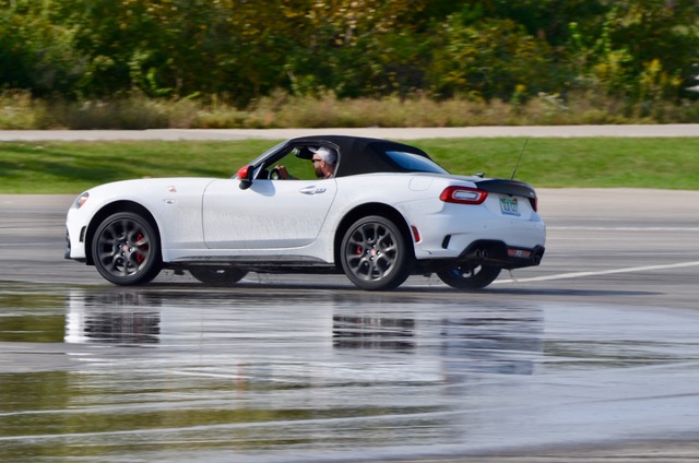Following a mid-day break the afternoon had us running an autocross circuit where you need to remind yourself that slower and smooth is better than too fast and jerky. We also drove a wet skid pad in the 124 Spider with our right-seat driving coach pushing us to increase speed and then yanking the handbrake and leaving us to recover from the oversteer skid.