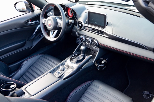 The sportier 124 Spider Abarth sits at the top, priced at $29,920. With Bilstein sport suspension, limited slip differential, front strut tower bar, sport-mode selector, the 124 is track ready. Options include Brembo brakes and Recaro seats.