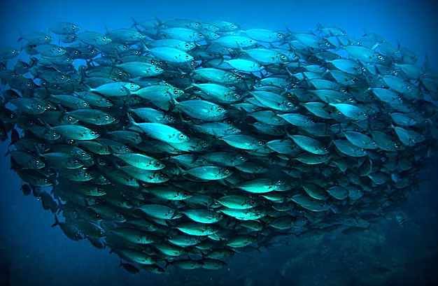 This (the picture above) is a bait ball. The school of mackerel in this photo believe there is safety in numbers and will stay schooled up like this even in the presence of predators. When attacked a few will survive, most won't.