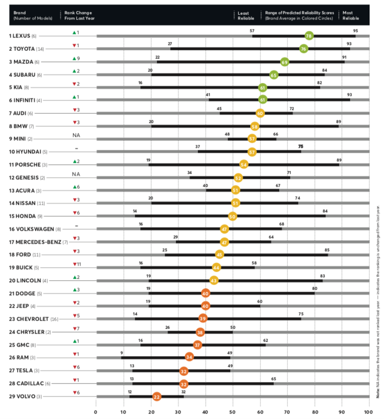 Kia drops two spots but remained in the top-ten as its all-new Stinger hatchback rates “Average” for reliability, as was the Sportage. Hyundai comes in at number 10, and its luxury Genesis brand is close behind. The G80 has “Above Average” reliability, and the G90 is below average, with reported problems in the area of body hardware and power equipment.