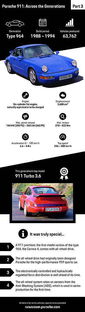 The turbocharged versions were the top-of-the-range 911 type 964 models. The 911 Turbo initially adopted its predecessor’s 3.3 liter engine, which at that time produced 320 PS, and the 911 Turbo S engine delivered an impressive 381 PS. The model was switched to the new 3.6-liter engine with 360 PS at the start of 1993, and the next in line was already knocking at the door from October of that year, and so the sports car icon took the next step. Porsche produced a total of 63,762 type 964 vehicles between 1988 and 1994.