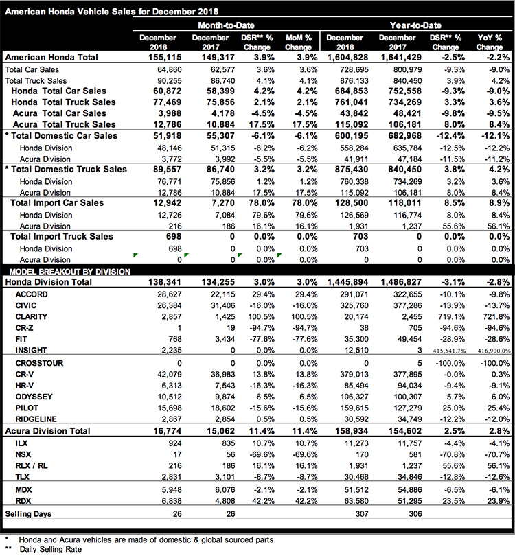"In 2018, we took advantage of the continued consumer shift toward light-trucks, contributing to another record year for our Honda and Acura light-truck businesses," said Henio Arcangeli Jr., senior vice president of the American Honda Automobile Division. "In addition to our light-truck success, our passenger car business also delivered another strong year, with Civic retaining its crown in 2018 as the best-selling retail compact car in America for nine years running and Accord commanding the highest transaction prices in the midsize segment. We remain bullish on the passenger car business and look forward to another great year in 2019 across our entire Honda and Acura lineups."