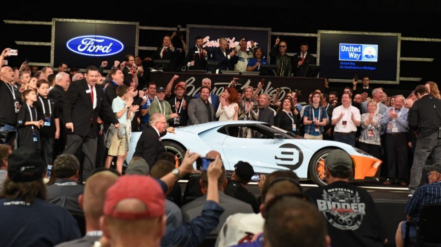 Hinrichs and Dr. Darienne Driver, president and CEO, United Way for Southeastern Michigan, drove the 2019 Ford GT Heritage Edition VIN 001 or lot No. 3012 across the auction block. Celebrating Ford’s 1968 Le Mans-winning race car with its original paint scheme, this Ford GT Heritage Edition features No. 9 graphics on the hood and doors, a ghosted image on the interior door panels, a unique serialized identification plate, and exposed carbon fiber inside and out.