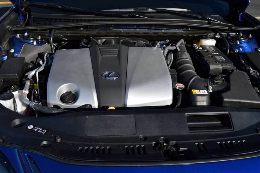 Despite its ample size and girth, the sport tuned ES proved surprisingly agile and quick. Bearing in mind that it weighs 3,845lbs and stretches 192in. long, the ES drove lighter and shorter than it is. Part of the fun here involved manipulating the Drive Mode Selector, which is niftily perched on a stalk protruding from the right side of the instrument binnacle. As soon as you dial up "Sport+" the instrument faces mutate from a common white on black format to full-race graphics, with bright white dial faces highlighted by day-glow pointers and redlines. The visual transformation puts a zip in your throttle foot before you even engage Drive. Not only does the suspension morph from flaccid to taut, but the steering feedback sharpens as well. Lexus has even insinuated a throaty V6 soundtrack into the cockpit, which plays its aria through that Mark Levinson system's 17 speakers and 1800 watts of output. As you sail effortlessly past slower traffic, you wonder "Am I really driving an ES 350 Lexus" because this one performs like no ES that has gone before it. Thanks to its over-square bore and stroke dimension (94mm bore x 83mm stroke) the 2GR-FKS power plant loves to spin toward that dayglow illuminated 7000rpm redline. The 8-speed gearbox, which replaces the outdated 6-speed of previous ES models, is fully complicit in your driving joy since it's equipped with paddles at the wheel, and a manual shift gate that puts you squarely in control of all gear operations.