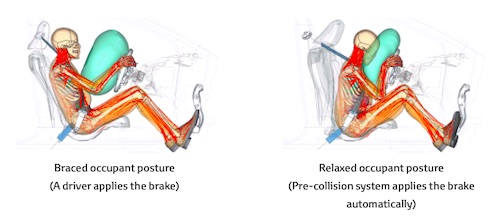 THUMS Version 5 simulates changes in occupant posture by considering occupants' pre-collision muscular states, while THUMS Version 4 accurately analyzes injuries sustained to bones and internal organs at the point of collision. Previously, injury researchers aiming to both simulate pre-collision changes in occupant posture and to analyze occupant injuries sustained at the point of collision were required to combine Versions 4 and 5 of the software. The newly developed THUMS Version 6 allows researchers to analyze both changes in pre-collision occupant posture and injuries sustained at the point of collision with a high degree of accuracy and, since there is no longer any need to switch between different THUMS versions, will also contribute to improved work efficiency. As preventive safety equipment becomes more widespread in tandem with the deployment of automated driving technologies, occupants are anticipated to assume a wider variety of postures at the point of collision than previously; in particular, driving support functions may result in drivers assuming a more relaxed posture. Toyota expects that THUMS Version 6 will be used in the development of safety technologies that help protect occupants in a variety of different conditions.