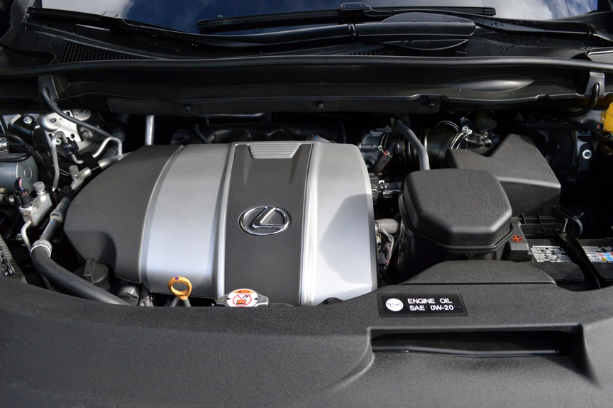 supplying an anemic turbocharged 4 cylinder motor (the norm in many mid-size SUVs these days), Lexus resolutely refuses to follow the downsizing script. Under the prominent hood of the bulbous Lexus, you'll discover a