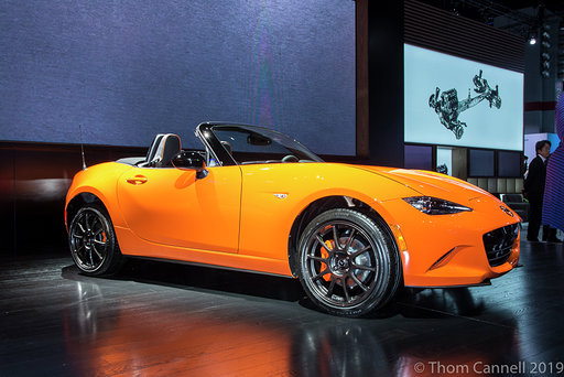 Mazda made a big orange splash with its most significant product, the iconic MX5 Miata sports car, showing the 30th Anniversary version. Limited to 500 deliveries in the United States (60-percent soft top) and 3,000 worldwide, all were reserved within four hours. It is priced at $34,995, excluding destination charges, and the only color is a way-cool Racing Orange. It comes with 17-inch Rays ZE40 RS30 wheels, Brembo front calipers and Nissin rear calipers in matching orange, Bilstein dampers for manual-transmission vehicles and Recaro seats featuring Alcantara trim inside. It was at the Chicago show that the Miata first came to our part of the world.