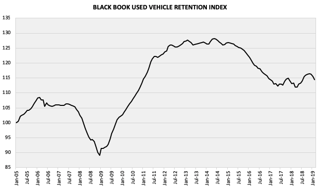 LAWRENCEVILLE, GA (March 6, 2019); Black Book, a division of Hearst that provides industry-leading used vehicle valuation and residual value forecast solutions, released its Used Vehicle Retention Index for February (114.5), a -0.8% change from January (115.4). The Index has also fallen -1.0% over the last twelve months. Click here to obtain a copy of the latest index data.
