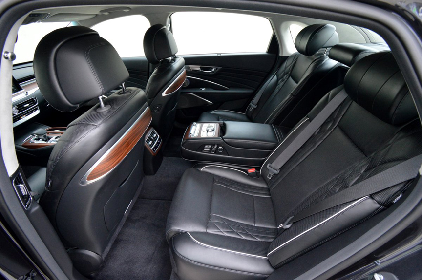 Considering its size, however, back road handling of the K900 proved surprisingly agile. Kia has fitted this top line offering with All Wheel Drive for 2019, so plenty of grip is available at all corners thanks to AWD and significantly upgraded Michelin MXM4 tires. Flashy 20 spoke aluminum alloy rims added a sparkle to the rather somber looks of our "Panthera Metal" (metallic black) test vehicle. The front rims measured 8.5Jx19" with 245/45R19 tires, while the rear 9.5Jx19" rims carried 275/40R19 rubber. The Michelins were branded with a Treadwear Rating of TW500 and a Traction rating of AA.