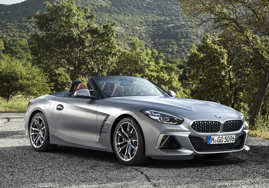 The new BMW Z4 M40i has a particularly sporty character with a Cerium Grey finish for the surround and front face of the mesh-design BMW kidney grille, the exterior mirror caps and other design features, plus trapezoidal exhaust tailpipes and 19-inch M light alloy wheels.