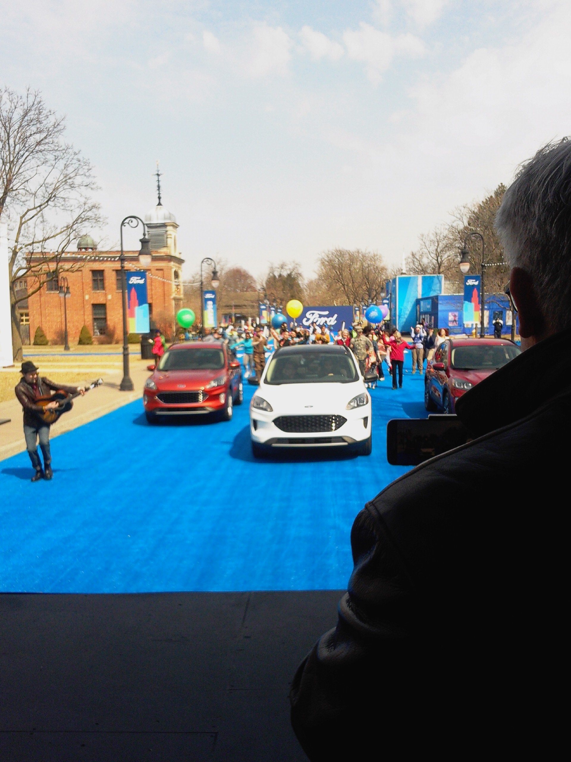 On cue, several football field lengths of bright blue carpeting covering village museum streets were inundated with dancers, athletes doing backflips, shooting basketballs, skimming around on scooters, singing, playing guitars, each carrying or wearing some text aspect of the new Escape’s innovations. Every visible prop, fixture, even buildings inside and out such as the original Ford factory from founder Henry Ford’s days to the airplane originators Wright Brothers’ bike shop were emblazoned with banners citing features on the new Escape.