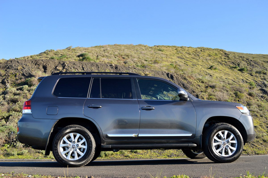 On the other hand neither of those low slung minivans will ever follow the Land Cruiser off road into wilderness territory. This ability to trek where other vehicles dare not tread has always been the strong suit of the Land Cruiser. The brute force needed for wilderness exploration is provided by the same 3UR-FE 5.7 liter V8 Toyota installs in its top echelon Tundra truck. This under-square unit (its 94mm bore is smaller than its 102mm stroke) produces enormous torque of 401lb.-ft. at very low rpm, as well as 381hp. The Cruiser will tow up to 8100lbs., so it's a logical candidate for transporting a medium size house trailer. Full time 4 Wheel Drive takes care of traction in any weather. At each corner, sizeable 285/60R18 Dunlop Grandtrek tires distribute the Cruiser's ample power without slippage.