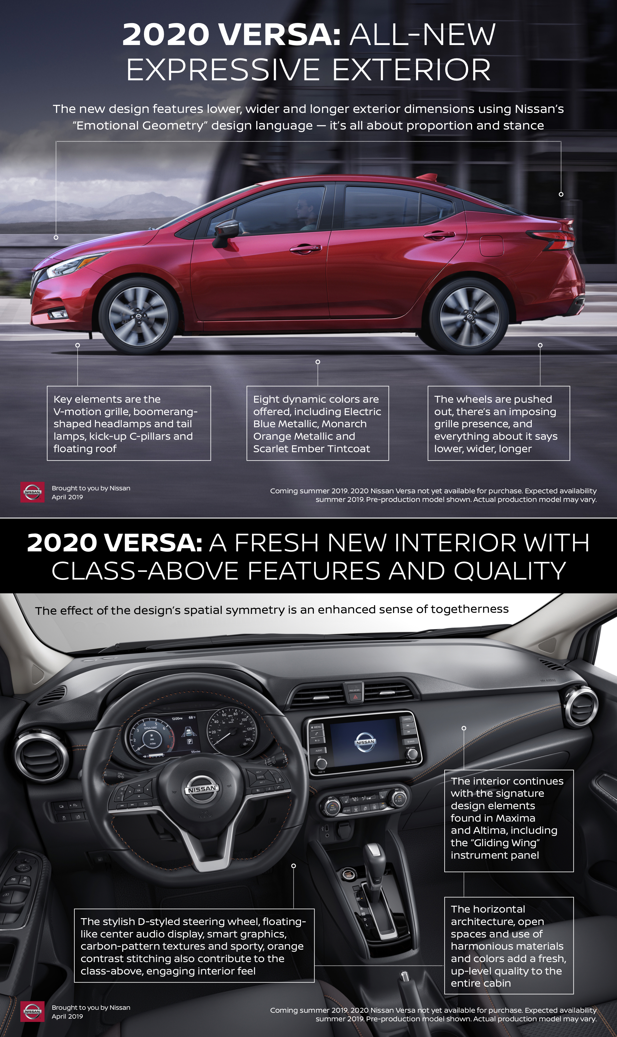 Design is also a key strategic advantage for the 2020 Versa, combining an all-new dramatic and expressive exterior with a fresh new interior with class-above features and quality.