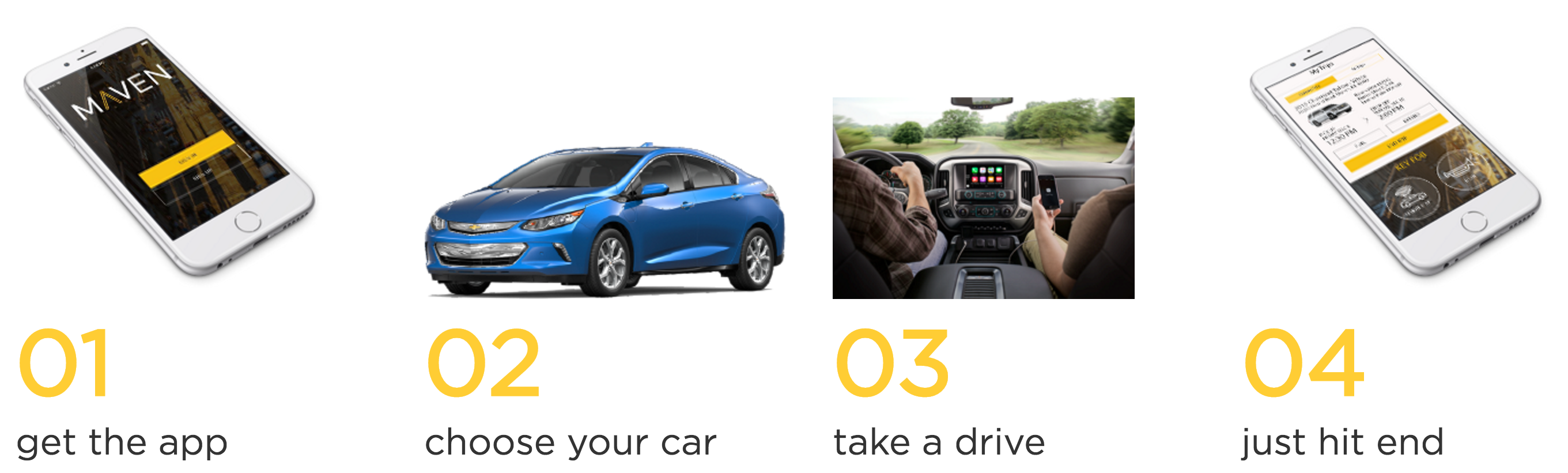 Maven competes with the likes of Zipcar and Car2Go, offering city folks a variety of GM cars at hourly and daily rates.
