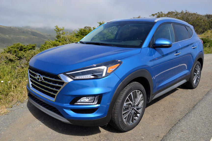 The Tucson is handy in ways you might not expect. Light towing chores, for example. You can pull a trailer (unequipped with brakes) weighing 1,600 pounds, or a trailer with brakes weighing 2,000 pounds. Inside the airy cabin, you'll find enough room to carry 5 adults and their belongings, or slip 29.5 cubic feet of goods aboard after dropping the rear seats flat. The interior layout of the Tucson is practical and sensible, with prominently located buttons for important climate and safety functions. But practicality does have its limits, and the Tucson interior could use a little color dynamism. As it stands in Limited form, the interior is a sea of black seats, dash and door panels unrelieved by even a hint of color. This stands in stark contrast to the stunning exterior shade of our test SUV. Done in metallic Aqua Blue, and enhanced with silver roof rails and matching silver rocker panels, the clean lined new Tucson cut a most dashing profile.