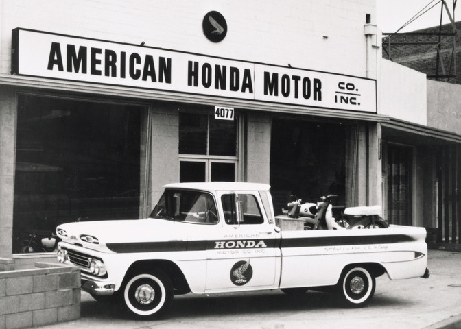 Shortly after American Honda Motor Co., Inc. (AHM) first opened for business in 1959, the company purchased a small fleet of Chevy pickups to deliver motorcycles to its fledgling dealers across Southern California. One of these trucks is depicted in an iconic photo circa 1961 in front of AHM's original office at 4077 Pico Blvd. in Los Angeles. Underscoring their importance during those early days, American Honda restored a truck to authentically match the one in the old photo, helping celebrate the company's 60th anniversary.