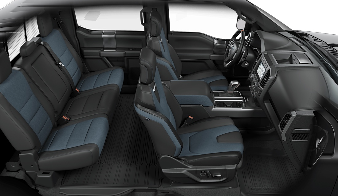Front seats are comfortable, if firm. They are well-defined with Raptor logos. Rear seats have tight legroom, and while the front seats have assist handles on the A-pillars to aid entry, rear passengers are on their own. Running boards with a rough surface similar to the bed’s spray-on lining aid in entry. The rear seats flip up for additional internal carrying capacity. At the rear of the center console there are two cupholders plus DC and AC outlets.