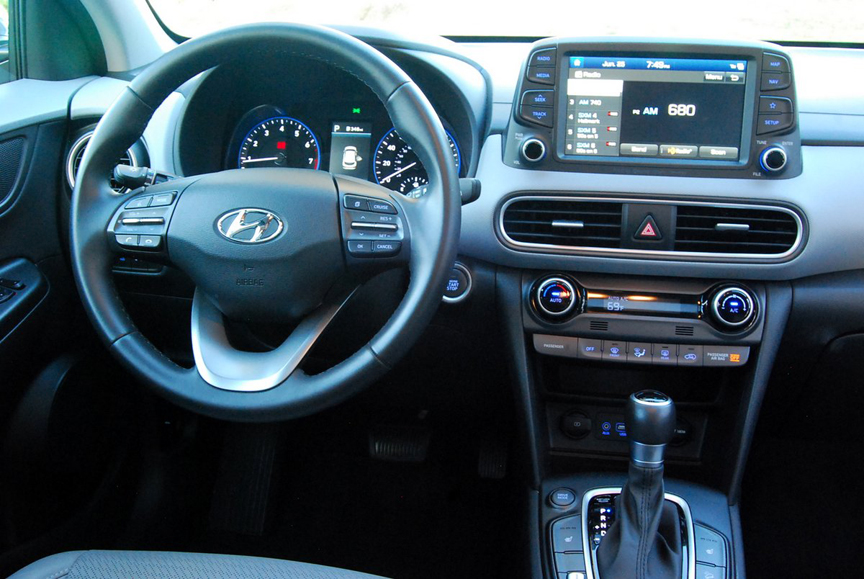 The Kona is enticingly easy to operate, with excellent instrumentation, large tachometer and speedometer, and obvious HVAC controls located atop the center stack. Topping the dash is a sensibly