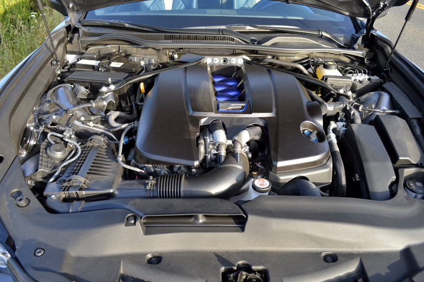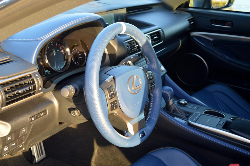 Although Lexus still catalogues various F Line accessories for different models, they have concentrated recent high performance efforts at building "F" models from the ground up. While the RC F may resemble the more prosaic RC coupe, the F version is significantly different. Under the hood lies an absolute beast of a V8, displacing 5 liters. With 32 valves, direct and port injection, plus variable intake and exhaust valve timing, this engine melts the pavement with 467hp and 389lb.-ft. of torque. To assist you in maximizing power application to the rear wheels, Lexus has coupled this V8 to an Aisin 8 speed "Sport Direct-Shift" transmission which you control via sizeable "F Spec Paddle Shifters." Lexus gives you the choice of 3 drive modes. "Eco," which is useful when loafing along at speeds, facilitates 25MPG highway gas mileage. The "Normal" setting encourages sprightly performance without resorting to a jiggly ride and an over sensitive throttle pedal. Choose the full "Sport" setting and you eliminate any vestige of comfort in favor of smash mouth brutality. Each setting brings its own instrumentation to the dashboard display. In Sport setting, the tachometer is redlined at 7500 rpm.