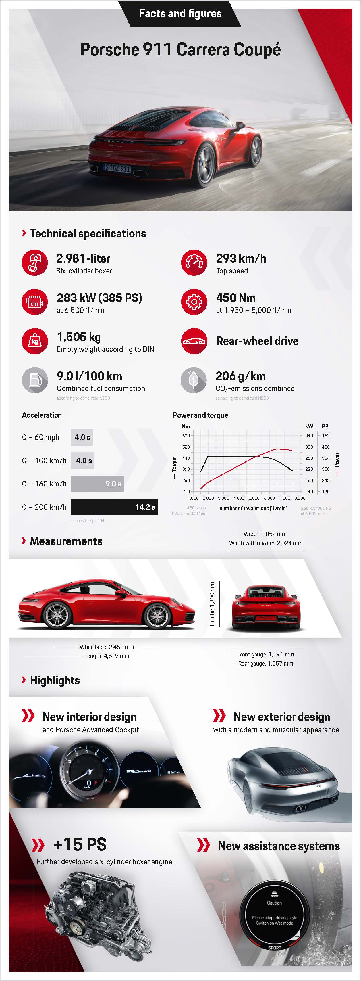 The new Porsche sports car is being launched as a Coupé and Cabriolet, and generates 283 kW (385 PS; Fuel consumption combined 9.0-9.2 l/100 km; CO2 emissions combined 206-210 g/km) from its 3.0-litre, six-cylinder boxer engine with biturbo charging. The Carrera is the entry-level 911 model and offers 11 kW (15 PS) more power output than its predecessor did. It shares its premium-quality standard features virtually unchanged from the 911 Carrera S. These include the high-quality interior with 10.9-inch touchscreen display, comprehensive connectivity and also innovative assistance systems like the Porsche Wet Mode that ensures even safer handling on wet roads. The 911 Carrera is distinguished by smaller dimensioned wheels and brakes and the individual tailpipe covers on the exhaust system.