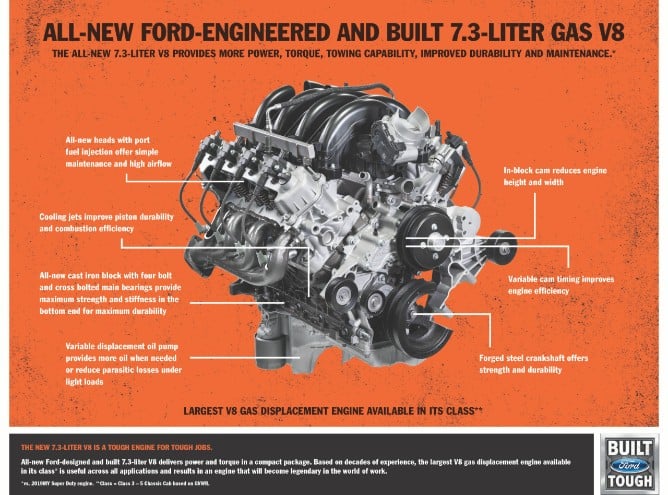 “The 7.3-liter is designed for maximum durability in the harshest environments given that our customers live and work in these conditions every day,” said Joel Beltramo, Ford manager for gas V8 engines. “This engine has the largest displacement in its class and is designed to provide benefits in key areas like power, durability, ease of maintenance and total operating costs.”