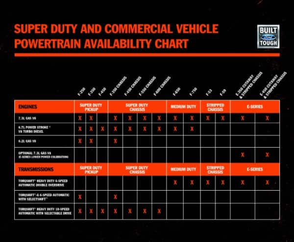 For F-250 through F-600 models the 7.3-liter engine is paired with the all-new Ford-designed and Ford-built 10-speed heavy-duty TorqShift® automatic transmission. All other commercial models retain the TorqShift® heavy-duty 6-speed automatic transmission.