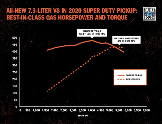 DEARBORN, Mich., Aug. 1, 2019 – Ford F-Series, America’s best-selling truck for 42 years, is once again raising the bar for capability with its all-new 7.3-liter V8 gasoline engine. The 7.3-liter engine in Super Duty pickup cranks out best-in-class gas V8 output of 430 horsepower at 5,500 rpm and best-in-class torque of 475 ft.-lb. at 4,000 rpm.