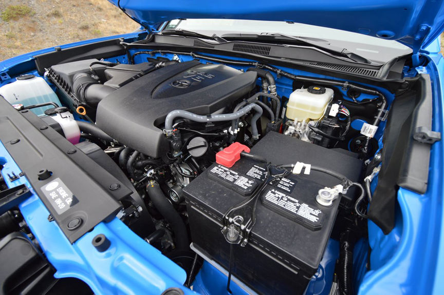 A standard TRD muffler contributes a mellow blat to the exhaust note of the Tacoma's 3.5 liter V6, which produces 278hp and 265lb.-ft. of torque thanks in part to dual variable valve timing. The reasonably