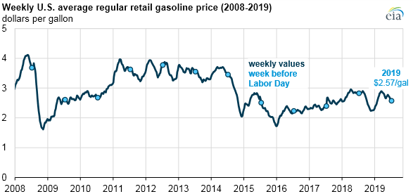 The U.S. average retail price for all formulations of regular gasoline on August 26, 2019, was $2.57 per gallon (gal), 25 cents/gal (9%) lower than the price at the same time last year. This drop in the gasoline price is a result of lower North Sea Brent crude oil prices (a global benchmark for crude oil and the most relevant determinant of U.S. gasoline prices), less gasoline demand, and higher gasoline inventories.