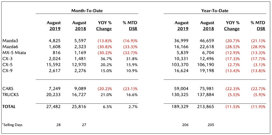 IRVINE, Calif. (Sept. 4, 2019) – Mazda North American Operations (MNAO) today reported total August sales of 27,482 vehicles, an increase of 6.5 percent compared to August 2018. Year-to-date sales through August saw a decrease of 11.5 percent, with 189,329 vehicles sold. With 28 selling days in August, compared to 27 the year prior, the company posted an increase of 2.7 percent on a Daily Selling Rate (DSR) basis.