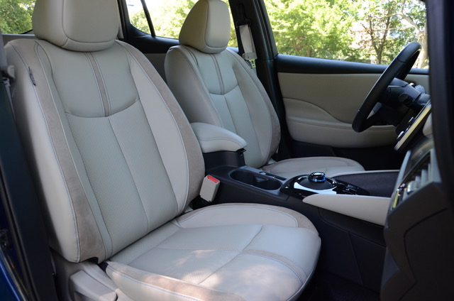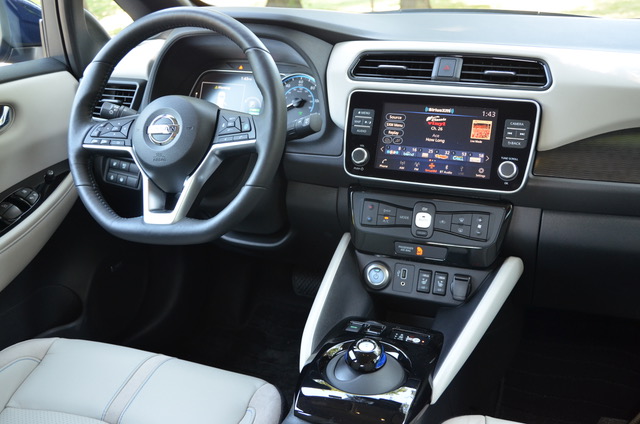 On the outside the Leaf Plus in not too big at 176.4 inches, which helps make for easy big city maneuvering. Under the rear hatch there’s 23.6 cu.ft. of cargo space that expands to 30.0 cu.ft. with the rear seat folded. The cabin is roomy and comfortable. The SL is quite nicely finished.