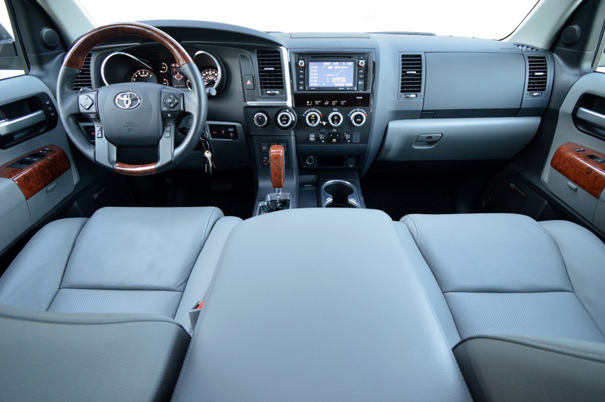 While Toyota has attempted to jazz up the interior of the Sequoia with segments of burled wood so shiny it looks like plastic, there's no chance you'll confuse this interior with that of a Lexus.