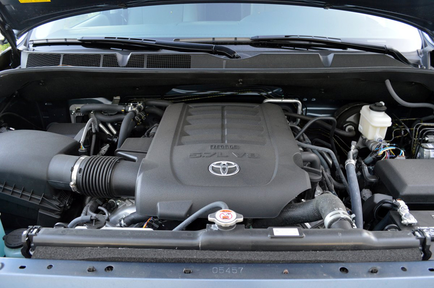 company's fabled 3UR-FE V8 which displaces 5.7 liters, makes 381hp and 401lb.-ft. of torque. This DOHC ,32 valve engine manages to endow even the ultra heavy Sequoia with a very decent