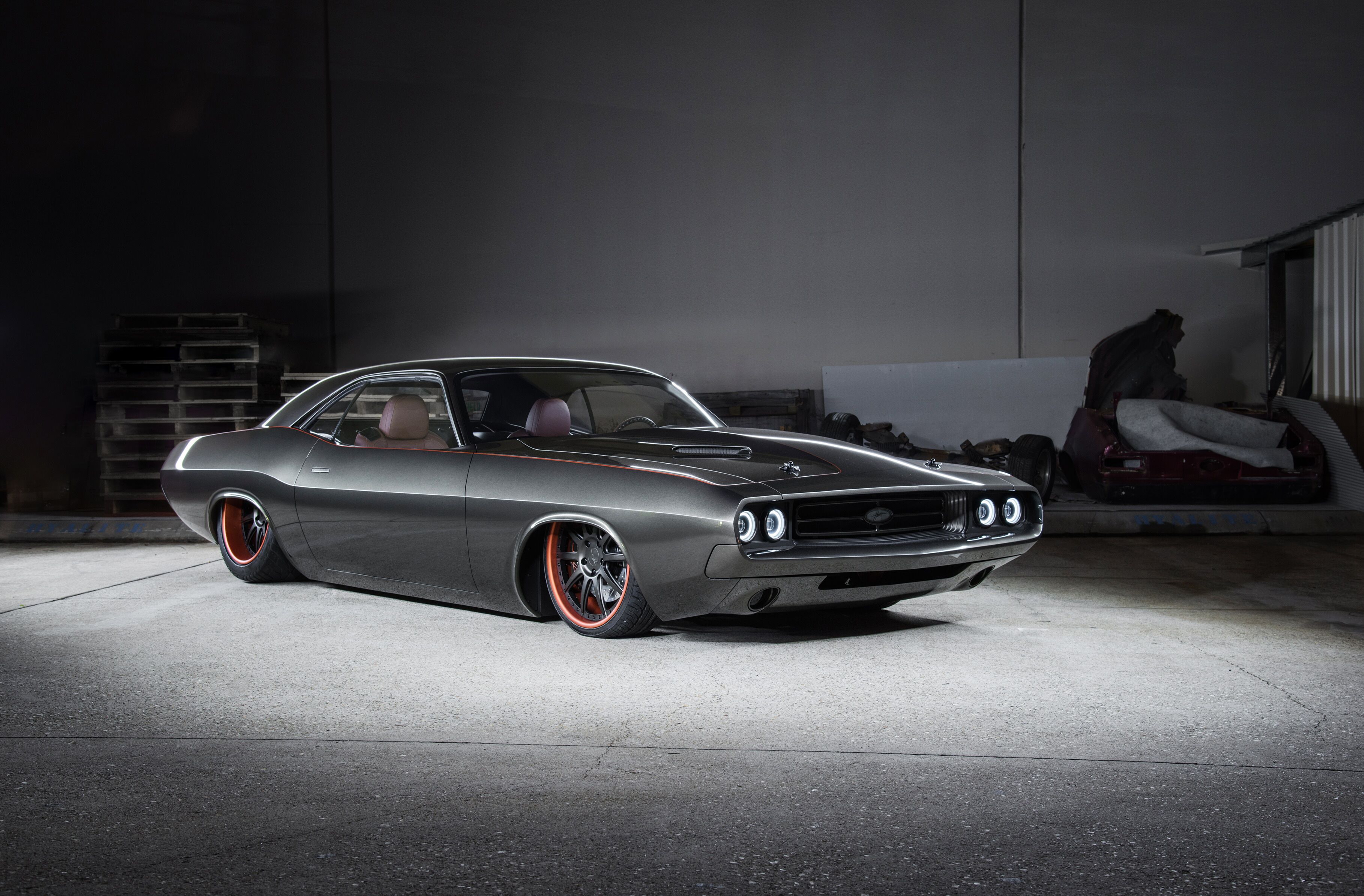 This year his Challenger is a completely hand-built custom design and is a spectacular combination of classic 70’s Mopar Muscle, modern advancements and brilliantly tasteful design touches. The car is almost all hand fabricated and sits on a Roadster Shop built chassis with full custom air suspension by RideTech. The powerplant is an astonishing 572 cubic-inch, 9.4-liter Hemi Big Block with crank-driven FR3 Pro Charger. The all-steel interior is hand-formed with custom brown double-stitched leather, and door handles supplied by Dave Kindig. Sitting over the subtly sculpted bodylines and flush-mounted bumpers is a PPG Vibrance Range Charlie Hutton Collection Slanted Brown on the lower portions with a custom mixed upper color. Both engine bay and interior are in the same brilliant color, but with a matte clear over top to provide a beautifully subtle contrast. SEMA this year will be the first time ever that this elegant beast will be seen in the U.S.