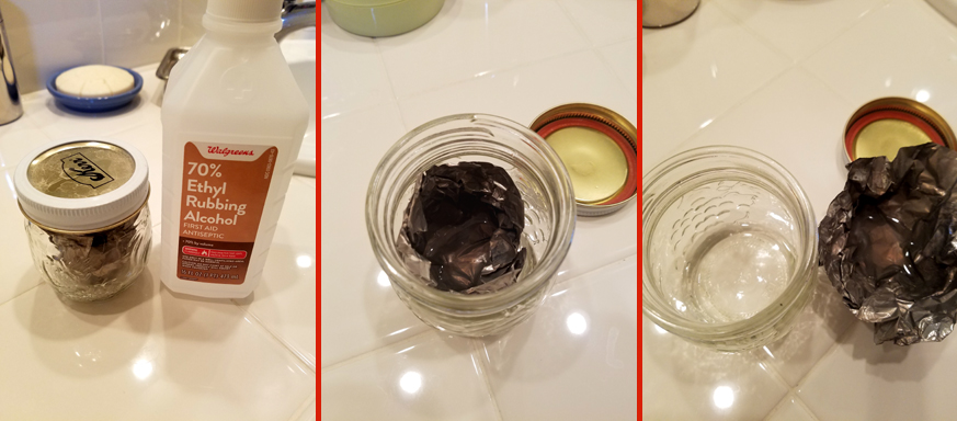 For my test, I took 70% ethyl alcohol (ethanol) and put it in a sealed jar with some common aluminum foil. The ethyl alcohol came from a plastic bottle of ethyl rubbing alcohol that I purchased from a local Walgreens pharmacy. It contains 70% ethyl alcohol and water, but no gasoline or aromatic of any type. It does contain a very small amount of ingredients to discourage anyone from drinking it.