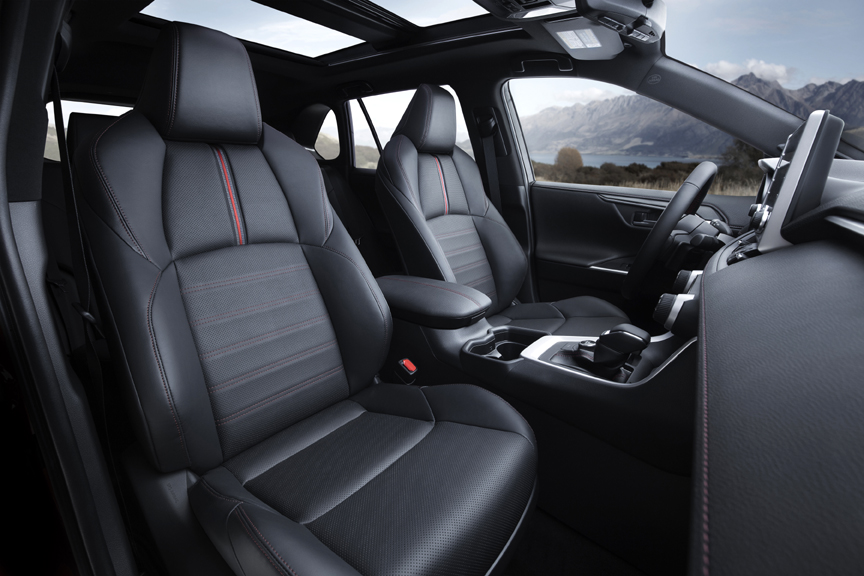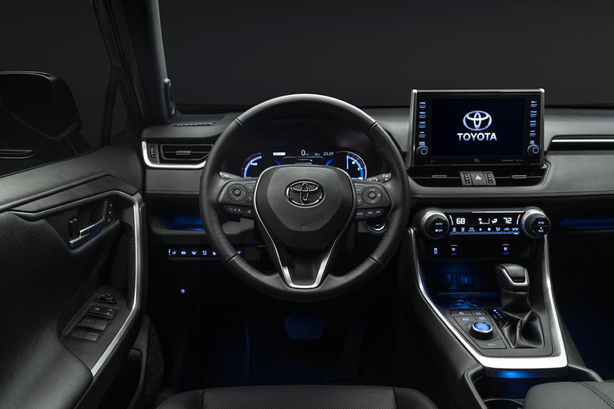 Inside, XSE steps up the sport, luxury and tech with RAV4's first-ever paddle shifters, along with moonroof, unique SofTex synthetic leather seat surfaces, wireless smartphone charging, ambient lighting, auto-dimming rearview mirror with integrated garage door opener and the largest multimedia screen in any RAV4 ever. The standard Audio Plus system comes with a 9-in. touch-screen and there is an available Premium Audio that includes Dynamic Navigation and JBL speaker system.