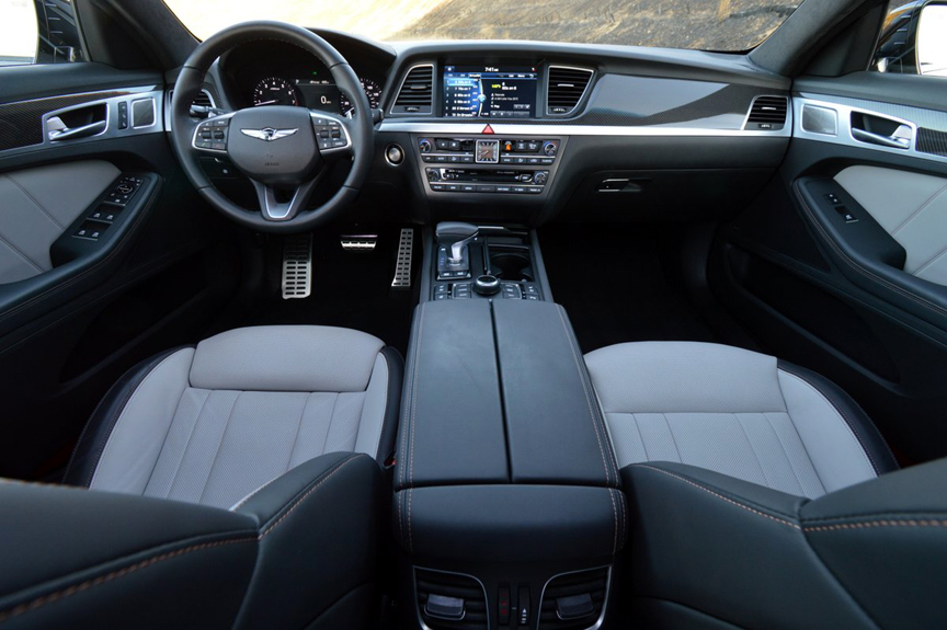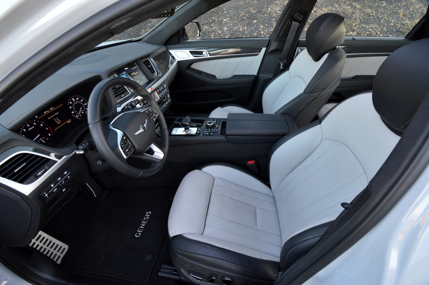version. The seats are more deeply bucketed for better retention, and the steering wheel rim is thicker and heated as well. The brakes are upgraded with Genesis branded calipers, and a special continuous