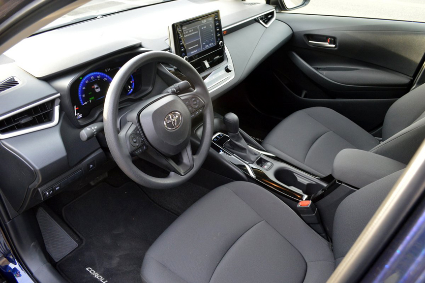 If your dash has more blank buttons than operative ones, you're probably driving an airport rental or this Corolla. The Hybrid's low price point becomes glaringly obvious when you slip into the driver's seat. To the left of the steering wheel you'll find a row of 5 rocker switches. Only two of them are labeled (dash display brightness and Headlight Auto-Dim) while three blanks await designation. An unrelieved tedium of black plastic stretches from one end of the dash to the other. Equally black seating surfaces are covered with the kind of serviceable nylon mesh you would expect to find on patio chairs. Since our test Corolla lacked XM Satellite radio as well as a CD player, we resorted to linking our I-Phone to the Corolla's Apple CarPlay system. Two USB ports are provided - under the dash and inside the console storage box - but only the one under the dash worked with the phone. And if you use AndroidAuto, you're still out of luck because the Corolla doesn't yet support that technology. Note that the under dash receptacle leaves the connection cord dangling in the passenger's footwell.