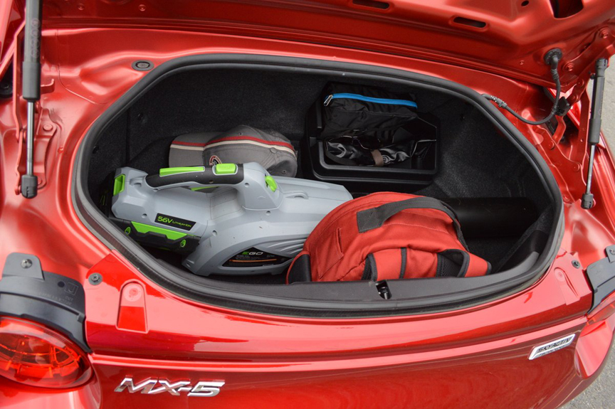 sacks, the Miata's tidy little footlocker will accommodate your daily needs. You'll want to stow just about everything in the trunk too, because the tight confines of the cockpit offer virtually no storage for