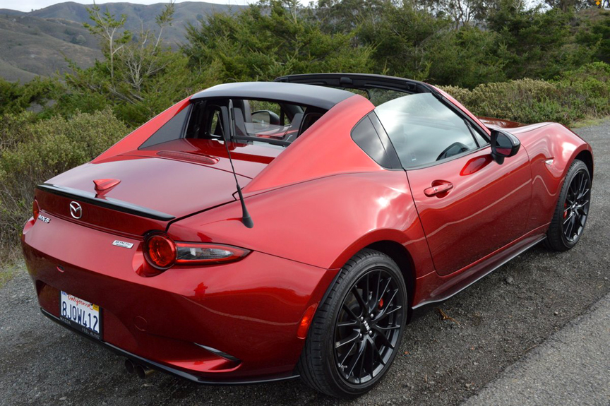 the roof's security and ease of operation, our test Mazda also looked significantly different from the standard MX-5, with flying buttresses faired into the tail behind both side windows. These impart a streamlined,