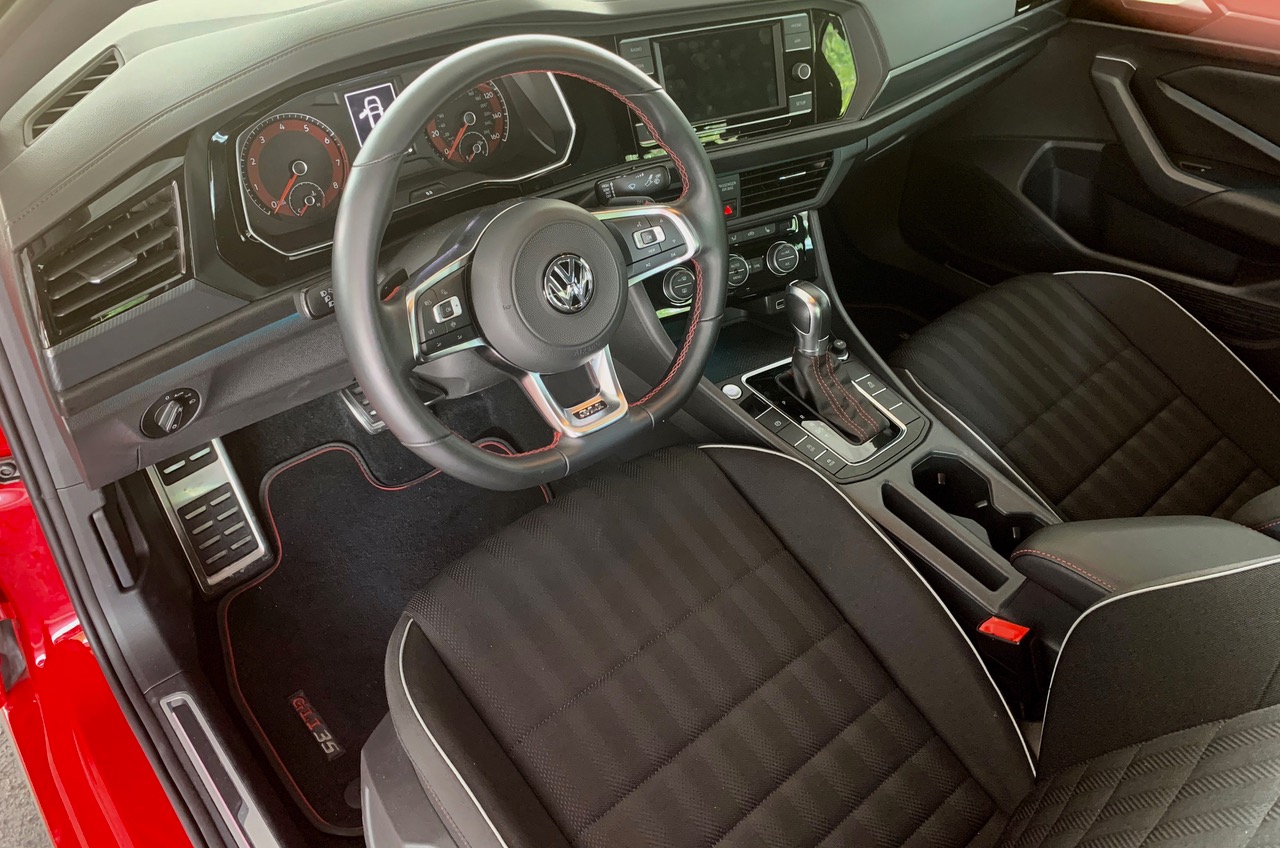 I picked up that vehicle at Southwest Florida International Airport. It had the same extreme red paint, though with a black roof and black mirror caps, plus the interior was fitted with trendier Titan Black cloth seating. Controls were the same as Jetta, though the GLI featured fully automatic temperature control.