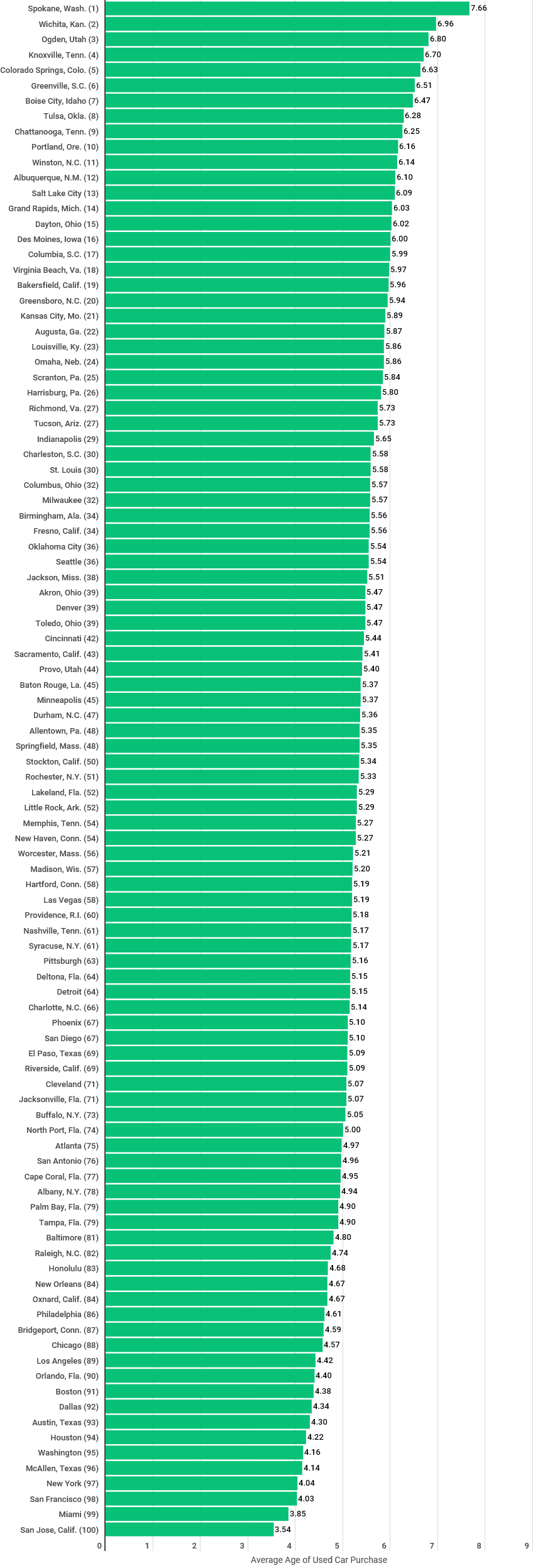 - Spokane, WA: Residents here sought the oldest cars, pushing the previous top city, Portland, Ore., to 10th place. Vehicles at least 7.66 years on average were what people sought to finance.