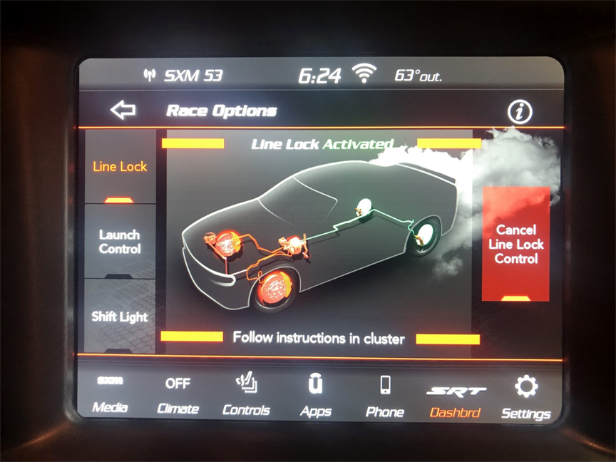The enthusiast’s magic is in the SRT Dashboard menus for performance. Options include different gauge selection, performance modes, of course adjustable launch rpm and a line lock for warming the rear tires. It doesn’t have the transbrake for that quick launch versus a standard brake torque but unless on a prepped surface with drag radials, its utterly useless in this car. The ZF sourced, TorqueFlite 8 speed transmission shifting, paddle shifter engagement, suspension firmness and steering weight can all be customized for track, sport and street settings. The Auto selection has them all in Street with Paddle Shifters enabled.