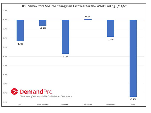 Compared to figures from the same week in 2019, average weekly gasoline demand volumes were down 8.4% in the Western part of the country alone from the same week prior year, according to the OPIS analysis.