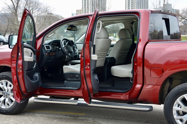 So yeah, the Nissan Titan at 228.2 inches long and 79.5 inches wide is a joy (not) in a big city. Add optional outside tow mirrors, the kind that extend when you are pulling a trailer, that are not power folding. Well, that becomes fun when you are driving solo and need to fold the passenger side mirror.